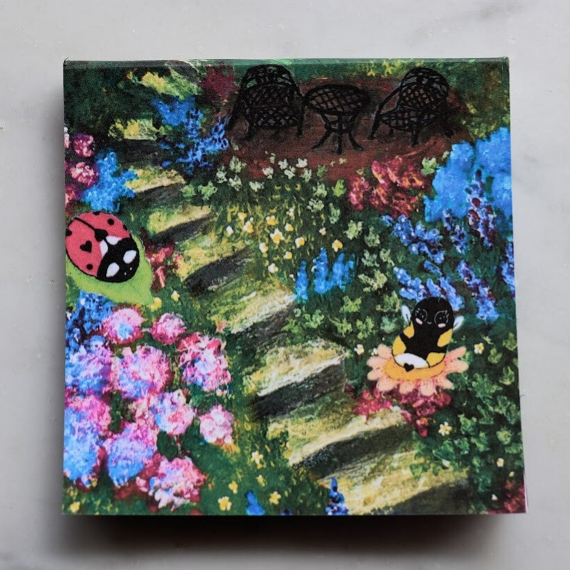 In dit blokje staan het lieveheersbeestje en het hommeltje! Met de achtegrond van de mooie bloemen tuin natuurlijk.