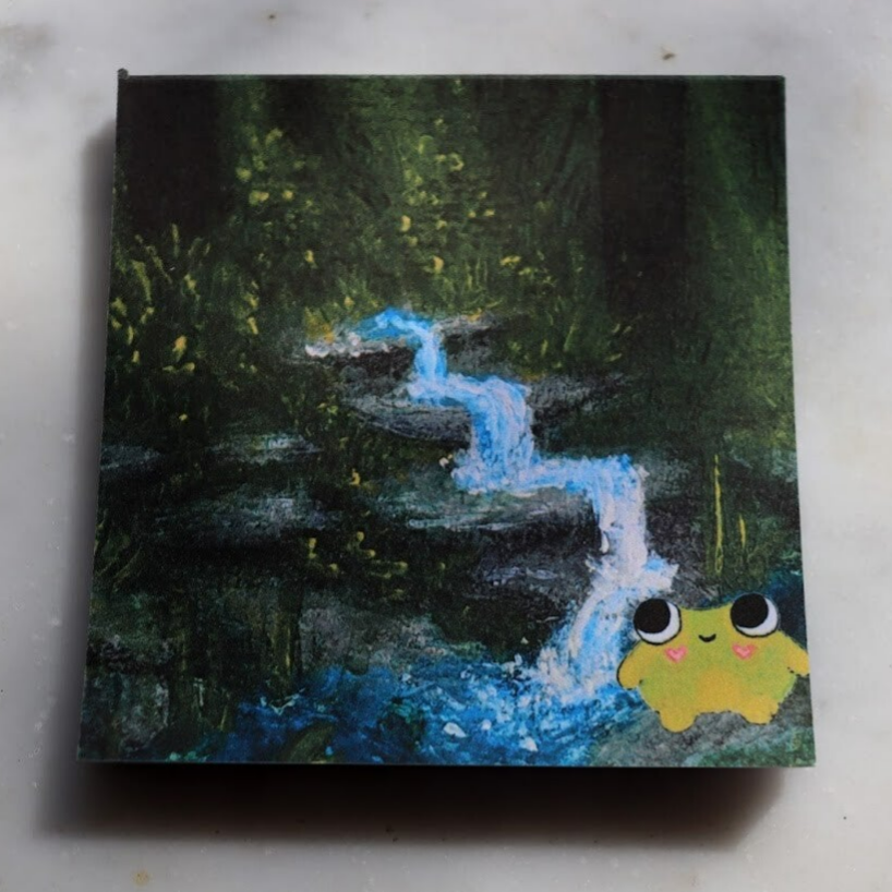 In dit blokje staat onze lieve kikker! Met de achtegrond van de het bos met de waterval.